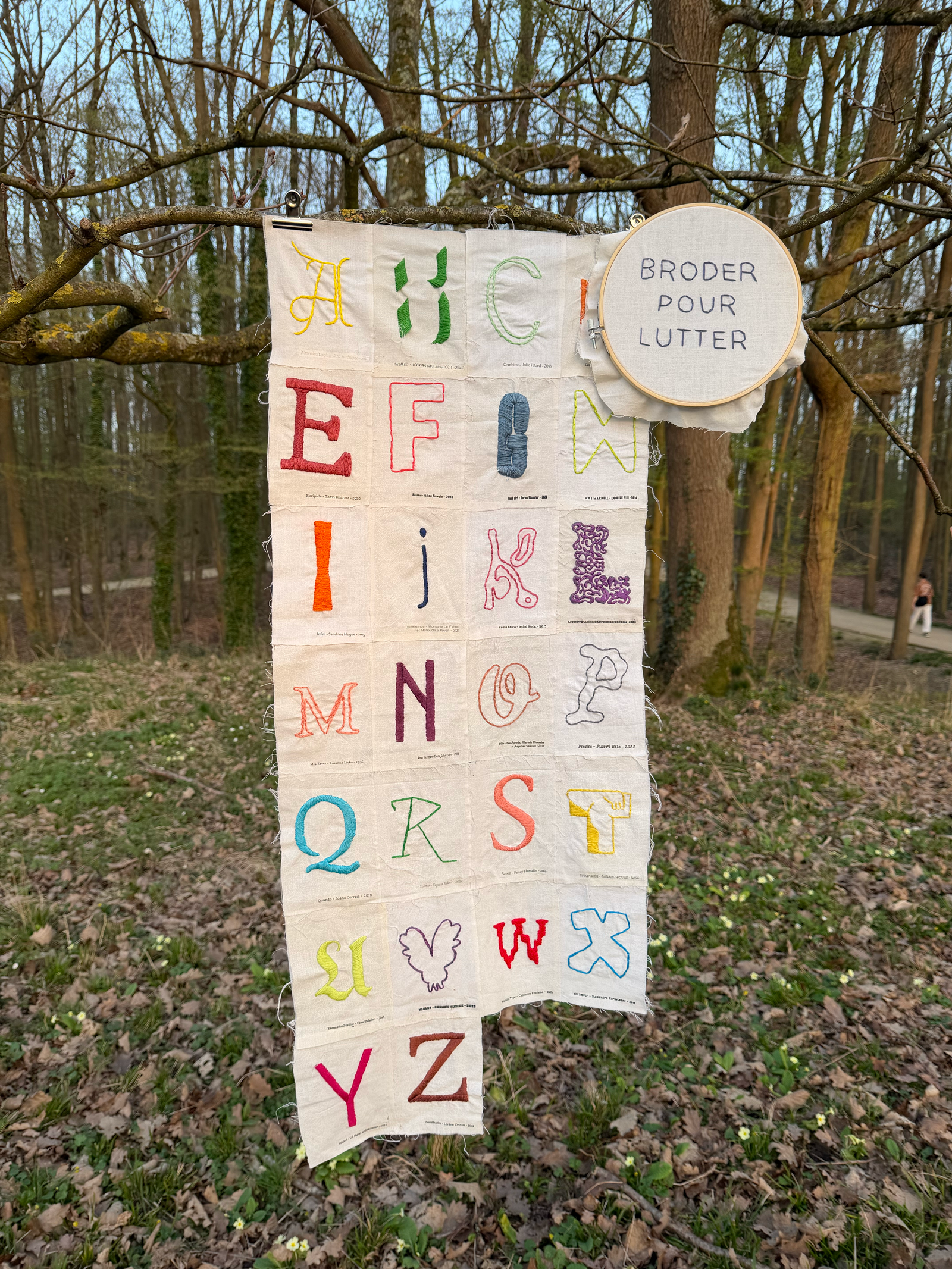 Cette broderie réalisée à la main recense exclusivement des typographies créées par des femmes, afin de mettre en lumière leur contribution à la production typographique, longtemps invisibilisée dans l'histoire du graphisme. La broderie, souvent reléguée au rang d'art mineur et associée à une pratique domestique féminine, est ici réutilisée comme un outil de réappropriation. Elle devient un moyen d'expression, d'émancipation et d'engagement, au service de la valorisation des créations typographiques féminines. Le geste lent et minutieux de la broderie fait écho au travail de conception des caractères, soulignant à la fois la rigueur, la patience et la force de ces productions.